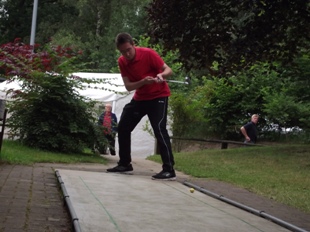 René Lemke mit Ass an Bahn 2 ... "Die Betonbahnen kann ich prima, nur drüben auf Filz klappt´s nicht so gut!" (Originalzitat René, der auf Eternit noch nicht zufrieden ist).
