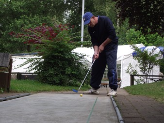 Gerade ist die Kreischgöre von gestern auf dem Tennisplatz eingetroffen. Es wird wieder laut werden. Mal sehen, ob die Minigolfer dagegenhalten. Walter Erlbruch bleibt davon unbeirrt, Ass an Bahn 2.