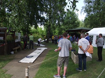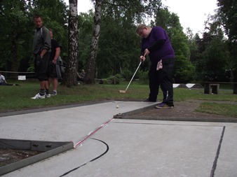 Die Finalrunden haben begonnen. Zunächst 1 Runde Miniaturgolf, dann 18 Bahnen Beton. Wenige Zuschauer, aber das wird sich morgen beim Lochwettspiel ändern, so wie ich die Trappenkamper von der DM 2010 noch kenne.
